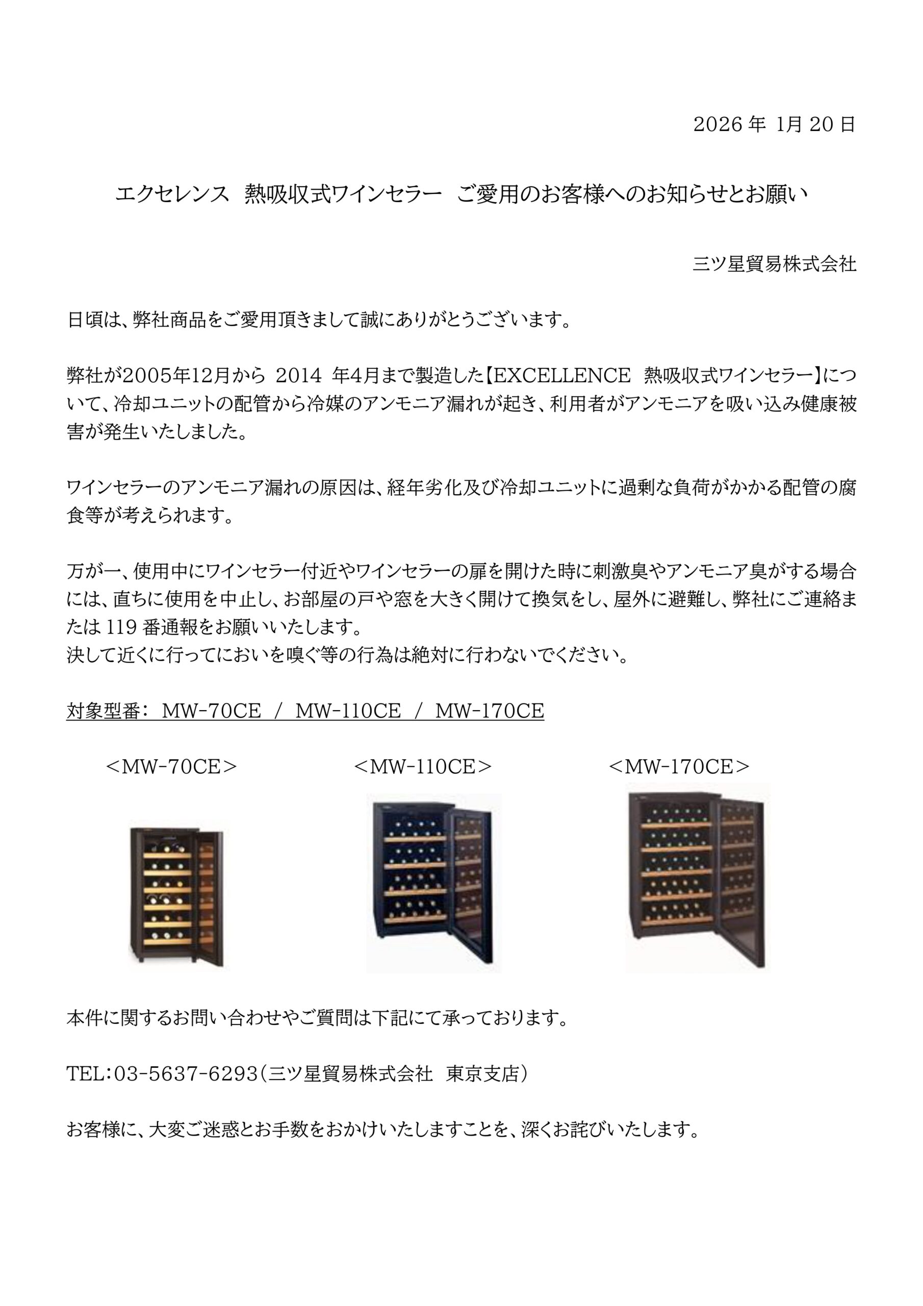 2026.1.20 エクセレンス 熱吸収式ワインセラー ご愛用のお客様へのお知らせとお願い | 三ツ星貿易株式会社 のイベント・ニュース